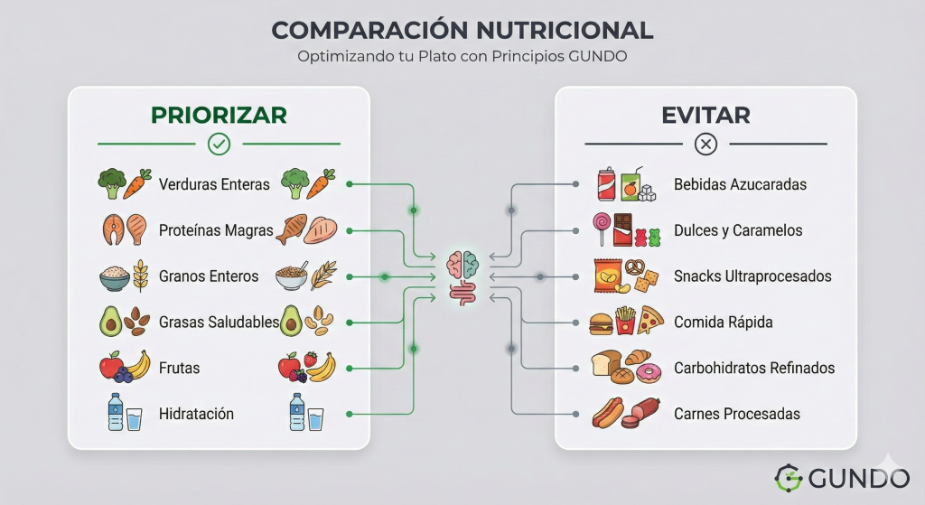 - El Enemigo Nº1: Alimentos Ultraprocesados (UPF): El informe representa una clara «derrota para los alimentos ultraprocesados». Los UPF son formulaciones industriales hechas con ingredientes que no usarías en tu cocina (aislados de proteína, aceites hidrogenados, aditivos). La evidencia científica citada es irrefutable: las personas que consumen dietas altas en UPF ingieren muchas más calorías sin darse cuenta.