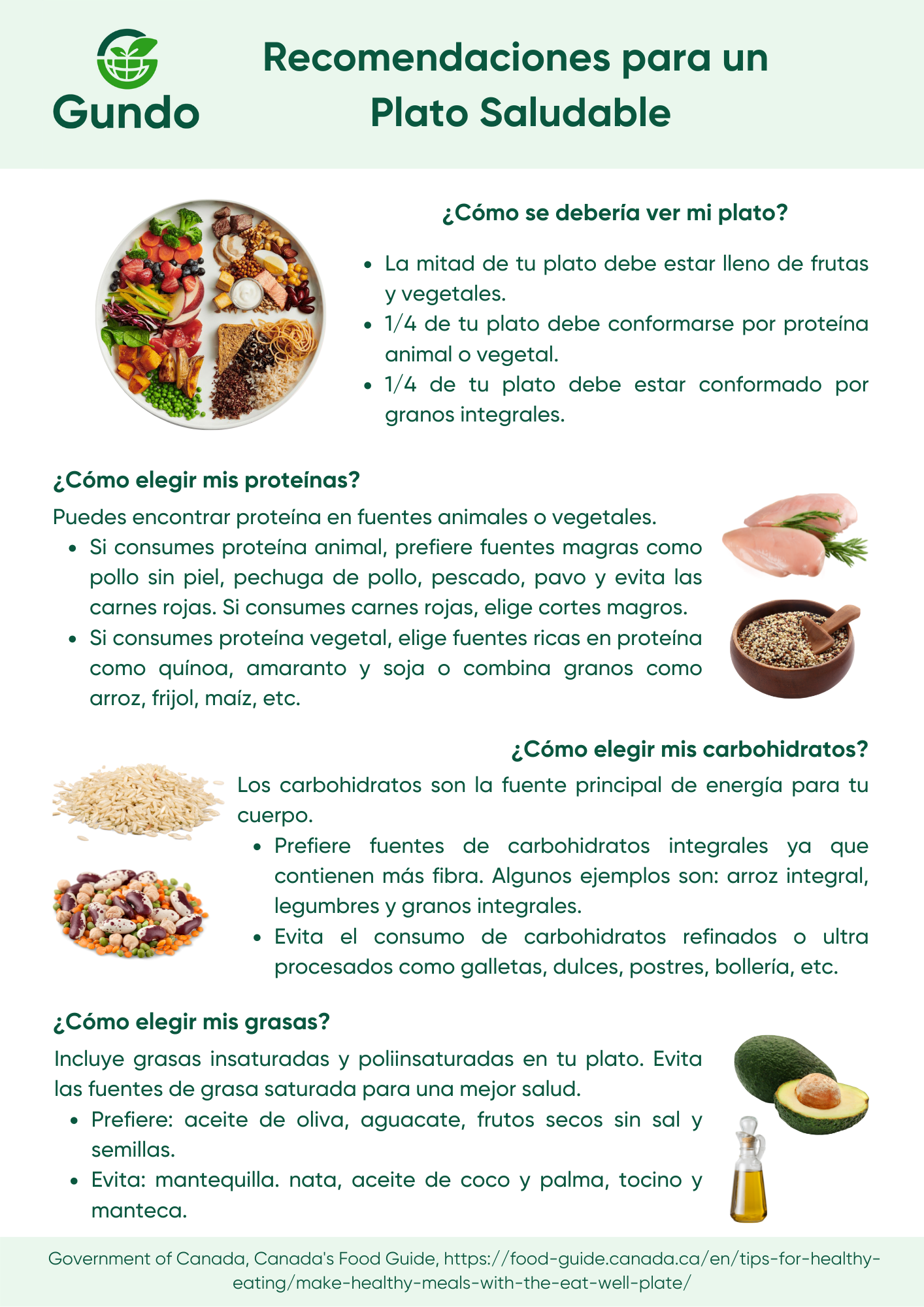 La proteína, carbohidratos y grasa cumplen con distintas funciones en el cuerpo y aportan energía. La proteína debe representar del 10-35% de la ingesta de calorías total del día y se pueden encontrar en fuentes animales (Ej. pollo, huevos y leche) o fuentes vegetales (Ej. Tofu, legumbres y soja). Los carbohidratos deben representar del 45-65%, se recomienda consumir fuentes de carbohidratos altos en fibra (Ej. Quinoa, granos, frutas y vegetales). La grasa debe representar del 20-35% de las calorías totales y se deben preferir fuentes de grasa insaturada (Ej. Aguacate, frutos secos y aceite de oliva) sobre las fuentes saturadas (Ej. Mantequilla, nata y embutidos) (6).